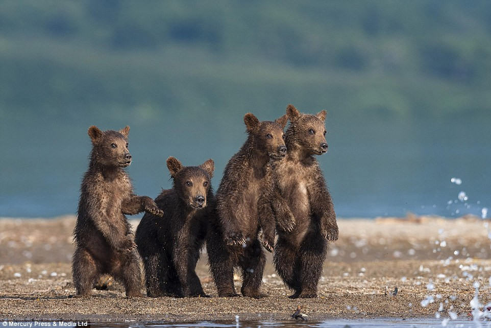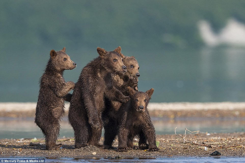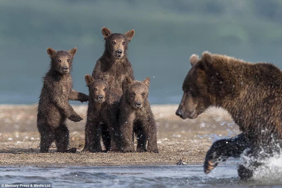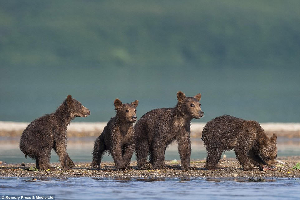 The baby bears are transfixed by their mother’s hands-on approach to finding their lunch at Kuril Lake in Russia.