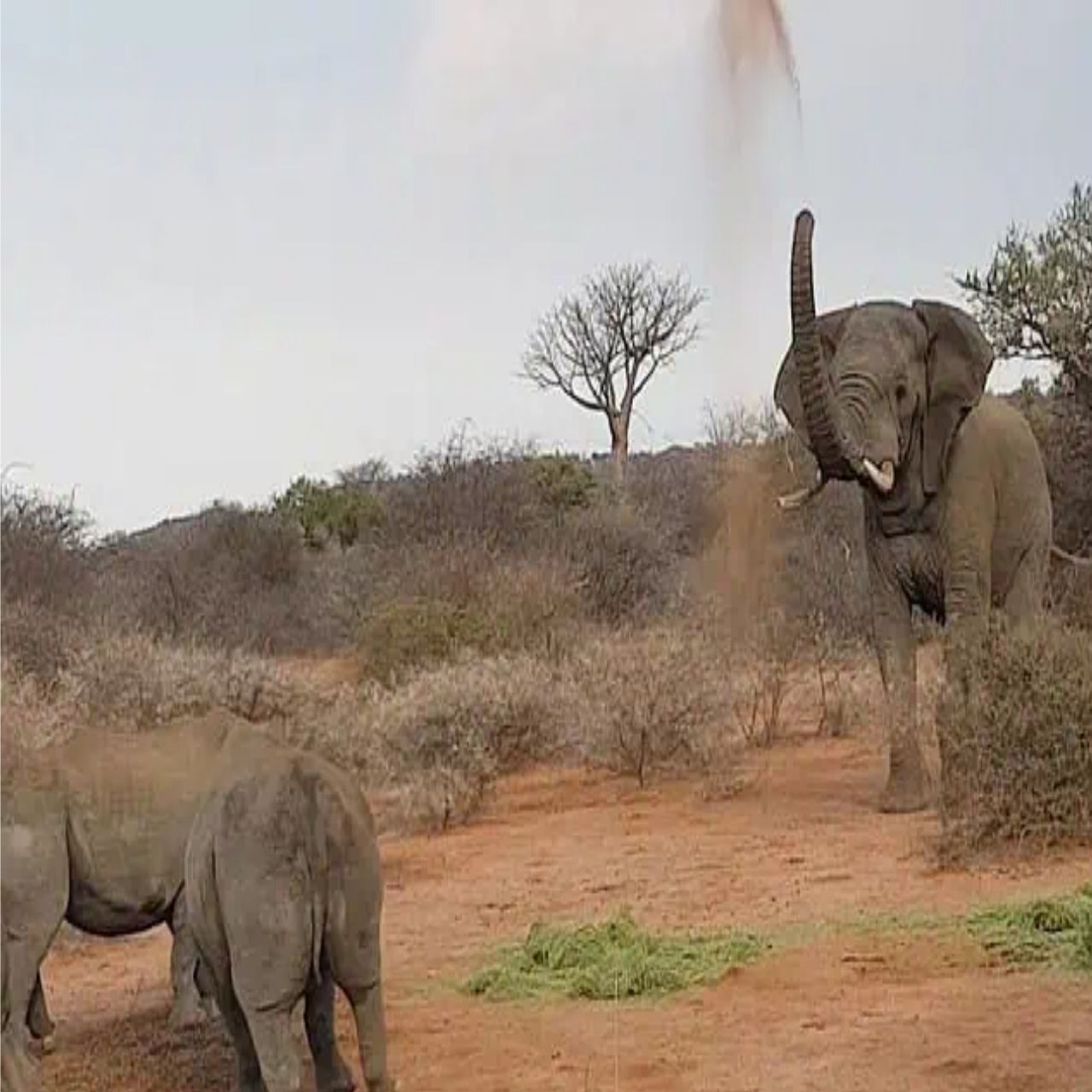 **Elephant Impressively Fends Off Rhinos to Claim a Meal**