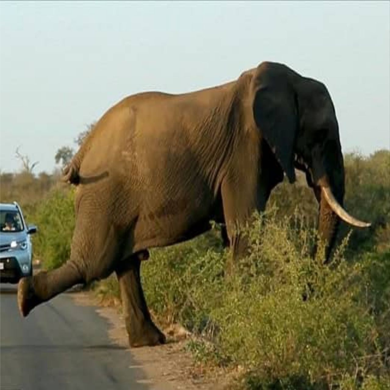 Elephant’s Morning Stretch Stops Traffic in Kruger National Park