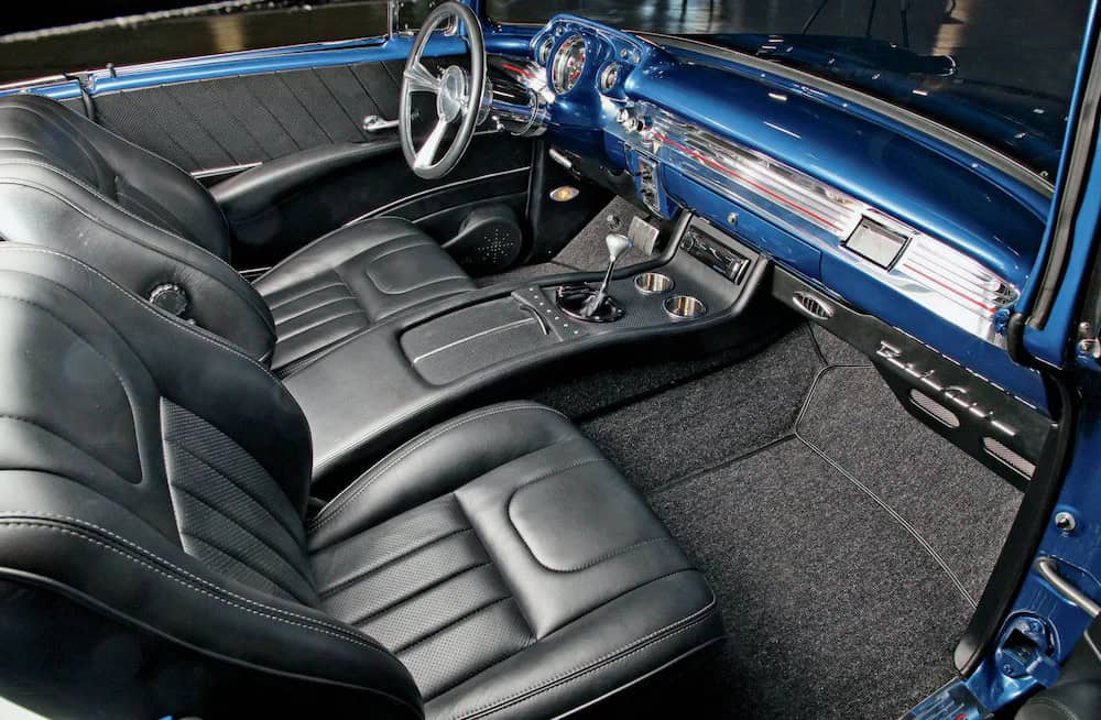 Step inside the 1957 Chevrolet Bel Air to discover a meticulously crafted interior adorned with chrome accents and elegant upholstery.
